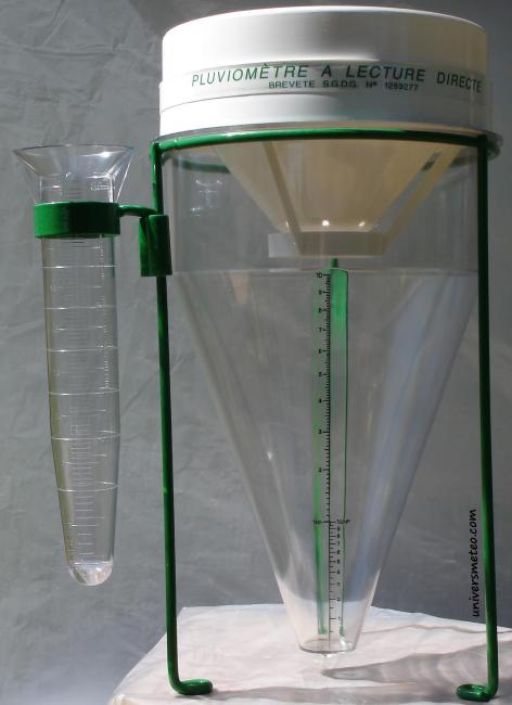 Le pluviomètre est un appareil météorologique destiné à mesurer la hauteur de précipitations tombée sur la surface terrestre sur un temps donné. Cette hauteur s'exprime en millimètres (mm) ou en litres par mètre carré.